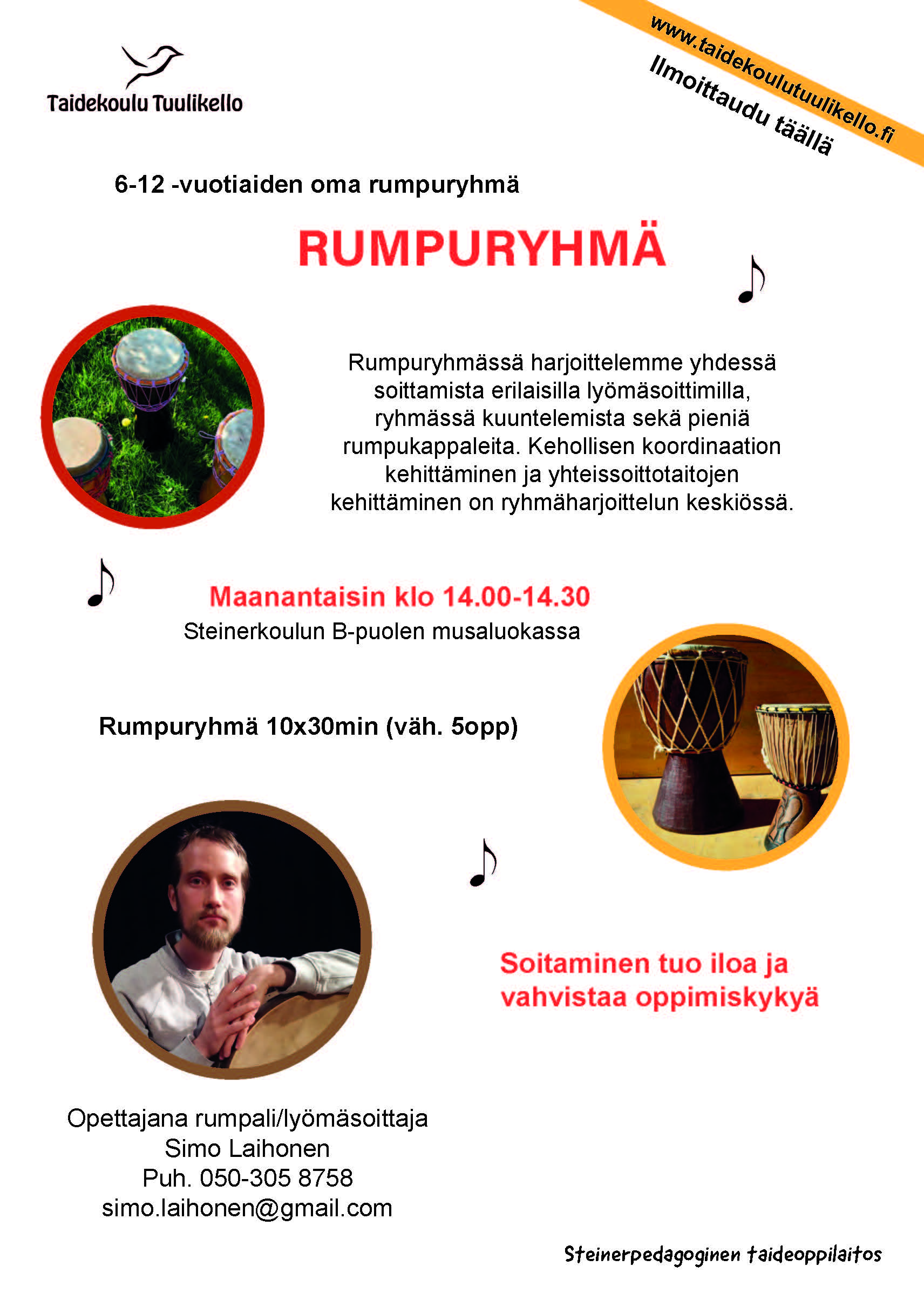 6.-12. -vuotiaiden oma rumpuryhmä odottaa innokkaita rummuttajia! Syksyllä 2022 rumpuryhmä kokoontuu b-mus luokassa maanantaisin klo 14.00. Tarvittaessa oppilaat noudetaan iltapäiväkerhosta.